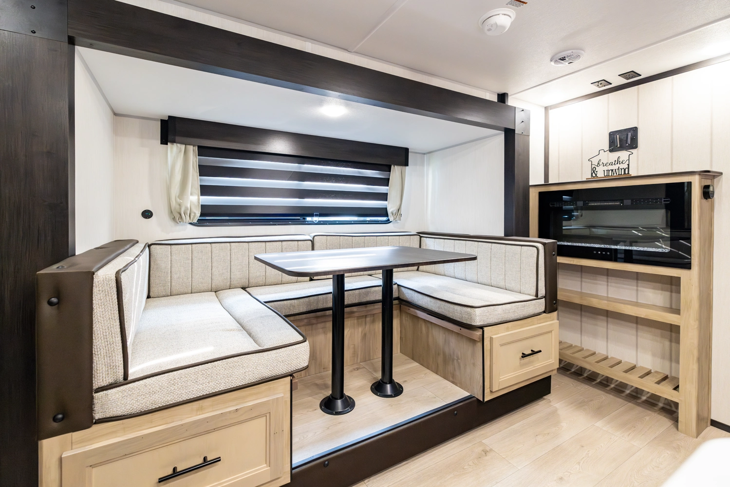 The Grey Wolf 23MK by Forest River is a perfect travel trailer for families and couples alike. The spacious U-shaped dinette, situated in a slide-out, offers ample seating and sleeping space. The rear sofa provides additional seating and a comfortable TV viewing area. The modern kitchen, with its full-size pantry, offers plenty of storage and prep space. The private master suite, with a queen-size bed and a full bathroom, provides a peaceful retreat.